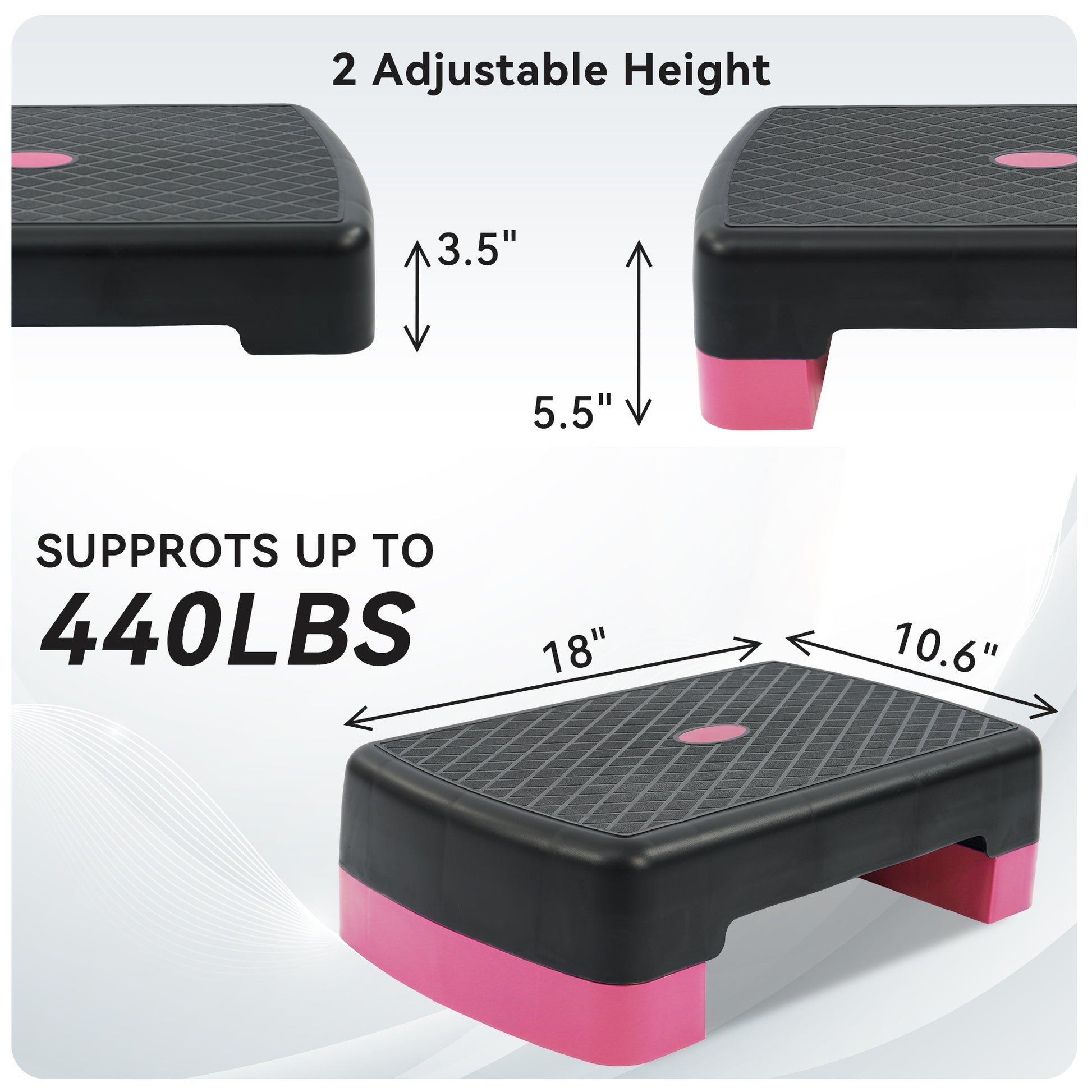 【Non-Slip Surface】Textured surface is non-slip, and shock absorbing, the surface with diamond knurl for enhanced grip and stability, ensuring a confident workout every time. 【Anti-Skid Rubber Feet】Equipped with thick rubber feet, this stepper stays securely in place during high-intensity workouts, protecting your floor from scratches. 【Adjustable Step Platform】18-inch long and 11-inch wide. Customize your workout with adjustable risers, allowing you to switch the height from 3.5’’ to 5.5’’ for different fitness levels and exercises. 【Space-Saving Design】Compact design for easy storage, lightweight and easy to carry. Fitvids step platform’s self-storable design allows you to store the additional risers underneath, making it convenient to store in your home gym. 【Multifunction Fitness Stepper】Constructed with the durable ABS material, maximum load capacity of up to 440 lbs. Ideal for aerobic exercises, strength training, and improving cardiovascular health while building muscle, toning your body, and burning calories.
